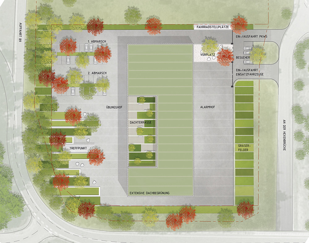 Die Struktur der Freianlagen bezieht sich auf die räumliche Organisation des Feuerwehrhauses und seine parallelen Aufstellflächen. Diese Bänderung wird über Alarmhof und Übungshof bis in den westlichen Gemeinschaftsbereich geführt, der sich dort mit der angrenzenden Waldlandschaft verzahnt. Einzelne rotlaubige Bäume mischen sich unter die Vegetation und nehmen Bezug auf die Nutzung des Ortes.