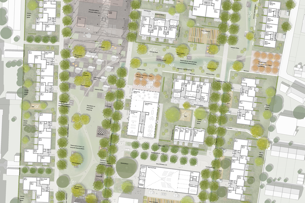 Angesichts der klimatischen, sozialen und wirtschaftlichen Herausforderungen des 21. Jahrhunderts soll der Stadtbaustein aber auch über sich hinauswirken. Das Herzstück des Entwurfs, das „Grüne Band“, ist daher auch als übergeordneter städtebaulicher Im¬puls ins umliegende Quartier zu verstehen. Alle wichtigen Funktionen sind entlang dem Band positioniert, und das Quartier orientiert sich konsequent auf diesen Raum hin, der auch als Frischluftschneise dient. Zudem ist das Areal (im Sinne der „Schwammstadt“) größtmöglich entsiegelt, wozu auch das gestufte Mobilitätskonzept beiträgt. Das Band ist konsequent MIV-frei (kein Durchgangsverkehr). Dies minimiert, kombiniert mit einer kompakten Baukörpersetzung, den Flächenverbrauch, ohne dass Unterbauungen nötig sind.